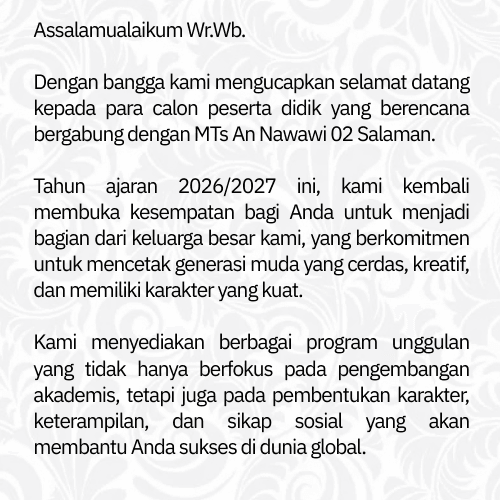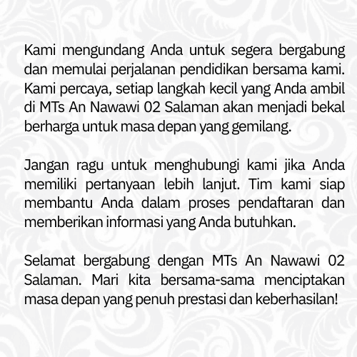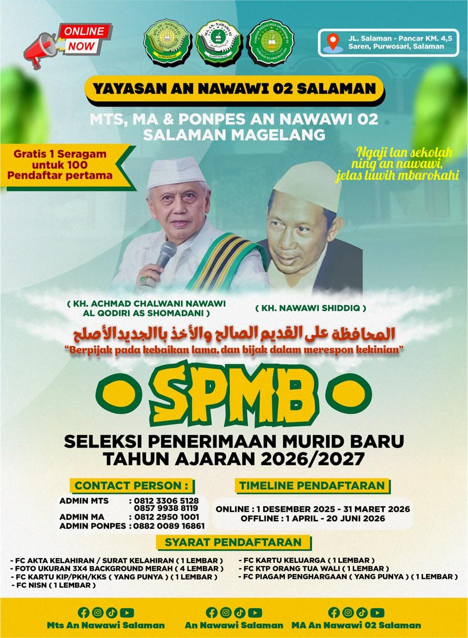 🔔 PENGUMUMAN RESMI | PPDB ONLINE MTS ANNAWAWI 02 SALAMAN TELAH DIBUKA | PENDAFTARAN MUDAH & BISA ONLINE | KUOTA TERBATAS! | HANYA MENERIMA 180 SISWA SAJA! BURUAN DAFTAR SEKARANG JUGA 🔔    🔔 PENGUMUMAN RESMI | PPDB ONLINE MTS ANNAWAWI 02 SALAMAN TELAH DIBUKA | PENDAFTARAN MUDAH & BISA ONLINE | KUOTA TERBATAS! | HANYA MENERIMA 180 SISWA SAJA! BURUAN DAFTAR SEKARANG JUGA 🔔